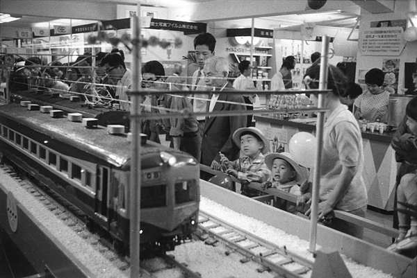 この電化完成を記念し、国鉄中国支社と朝日新聞社は「あすの国鉄展」を福屋百貨店で開催。当社は新聞広告での告知や入場切符などの印刷物、会場設営などを担いました。会場では、国鉄新幹線や電気機関車の模型、図解の陳列などで人々を魅了。6日間の会期中に訪れた来場者は約14万人でした。これは「開店以来初めての人出だ」と福屋百貨店が驚くほどでした。明るい未来を願う広島県民に、たくさんの夢と感動を与えたことでしょう。